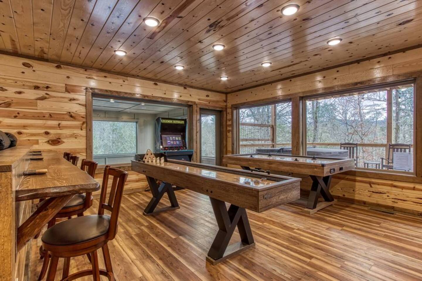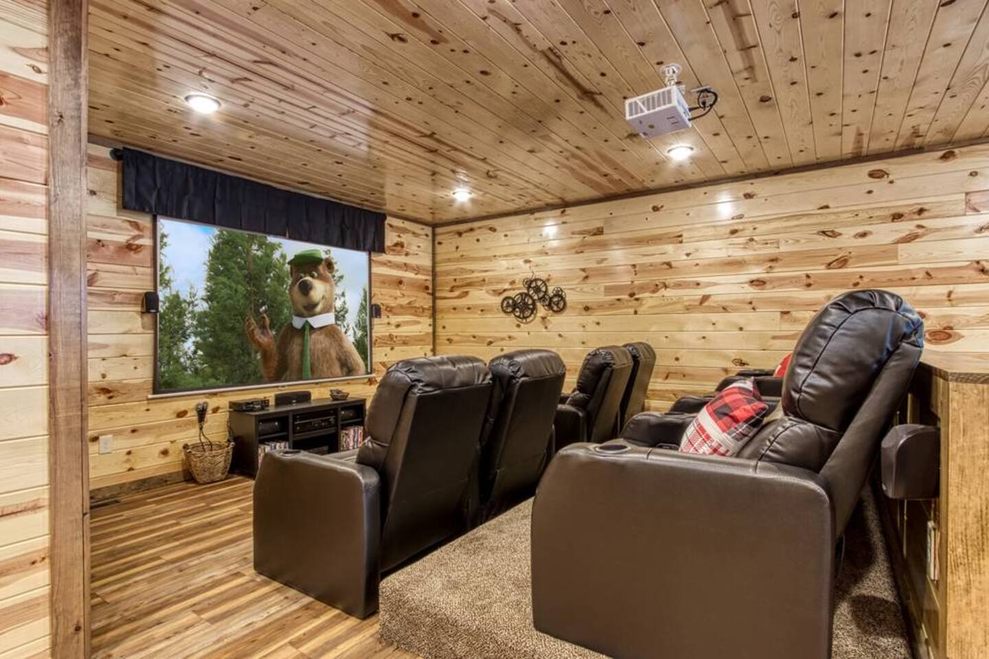 Indoor Pool • Luxury Cabin • Theater Gather family and friends in 5 ensuite bedrooms, splash year-round in your private indoor heated pool, unwind in the hot tub, then catch a movie on the 100” movie theater with theater seating. Game room with arcade, air hockey, and shuffleboard. Outdoor fireplace with TV, two decks, fire-pit Starlink Wi-Fi and parking for 4 cars 12 min to Pigeon Forge, 24 min to Gatlinburg. Book your "Da Bears Cabin" stay today!